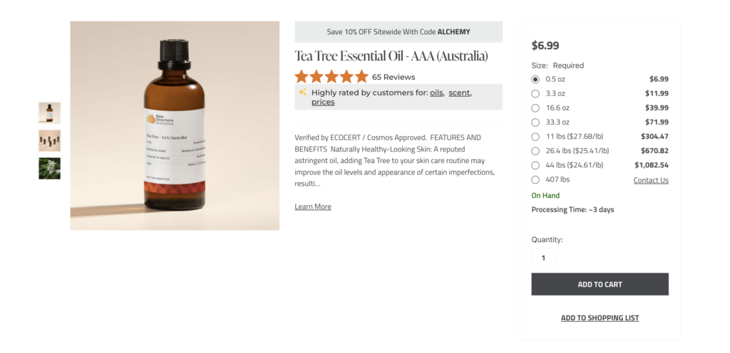 New Directions Aromatics is a leading supplier of premium raw materials and essential oils for cosmetics, soap, candles, and other handcrafted scented products. The company prides itself on providing exceptional customer service and a seamless shopping experience for businesses of all sizes.